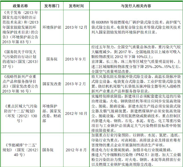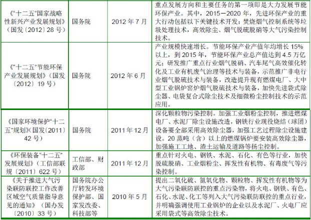 根據(jù)《國務院關(guān)于印發(fā)大氣污染防治行動計劃的通知》(國發(fā)〔2013〕37號)的要求,到2017 年,全國地級及以上城市可吸入顆粒物濃度比2012 年下降10%以上;京津冀、長三角、珠三角等區(qū)域細顆粒物濃度分別下降25%、20%、15%左右;加快重點行業(yè)脫硫、脫硝、除塵改造工程建設。所有燃煤電廠、鋼鐵企業(yè)的燒結(jié)機和球團生產(chǎn)設備、石油煉制企業(yè)的催化裂化裝置、有色金屬冶煉企業(yè)都要安裝脫硫設施,每小時20 蒸噸及以上的燃煤鍋爐要實施脫硫。除循環(huán)流化床鍋爐以外的燃煤機組均應安裝脫硝設施,新型干法水泥窯要實施低氮燃燒技術(shù)改造并安裝脫硝設施。燃煤鍋爐和工業(yè)窯爐現(xiàn)有除塵設施要實施升級改造;京津冀、長三角、珠三角等區(qū)域要于2015 年底前基本完成燃煤電廠、燃煤鍋爐和工業(yè)窯爐的污染治理設施建設與改造,完成石化企業(yè)有機廢氣綜合治理。